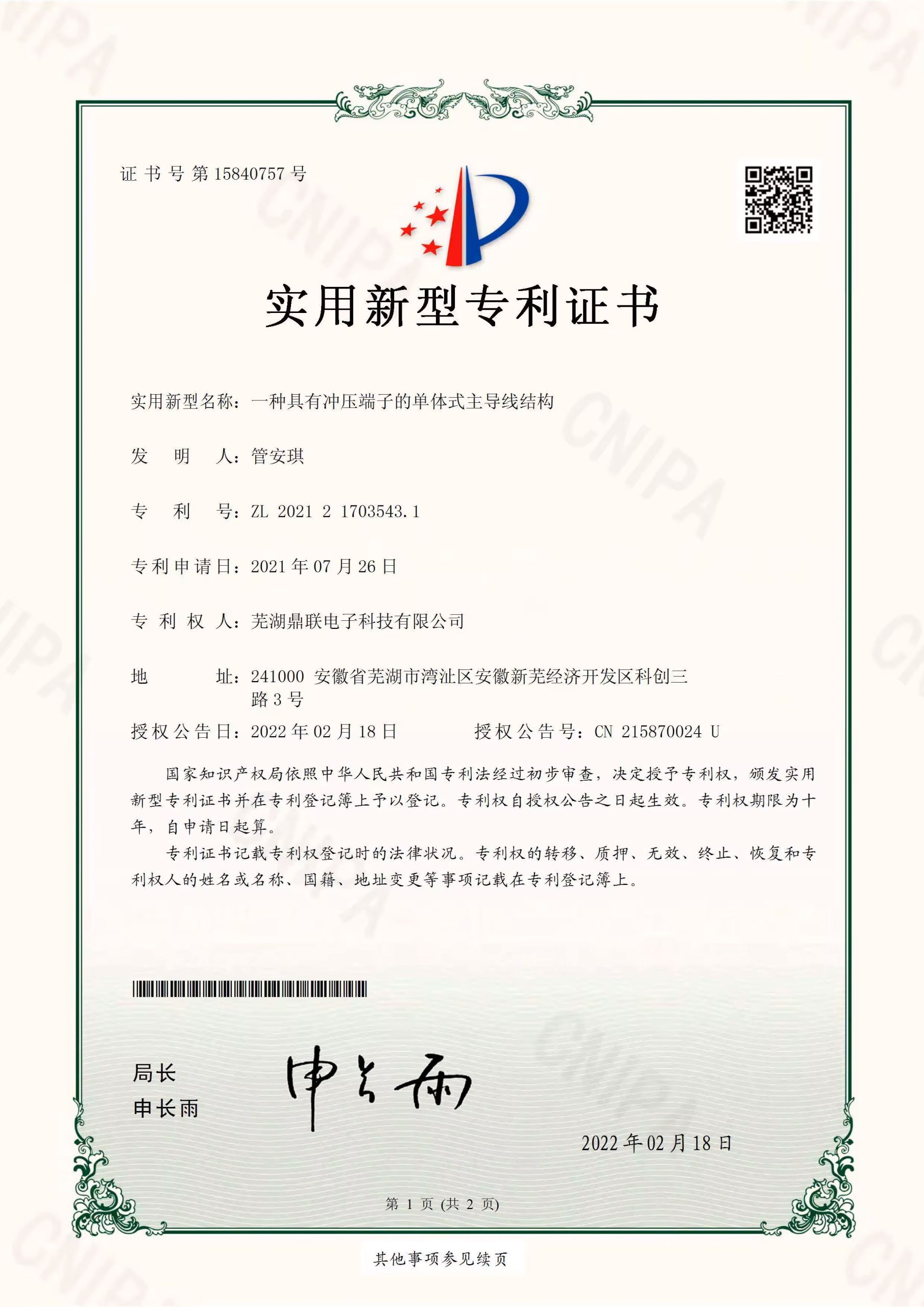 A monolithic lead structure with stamped terminals Patent Certificate for Waterproof Connectors